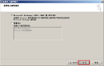 第三步,選中“Microsoft Exchange、POP3、IMAP或HTTP”后,點擊【下一步】;