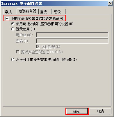 第七步,在彈窗中選擇【發送服務器】子欄目,勾選【我的發送服務器要求驗證】,點擊【確定】