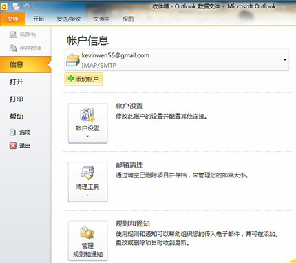 第一步,打開Microsoft Outlook2010,點擊【文件】->【信息】 ->【添加帳戶】;
