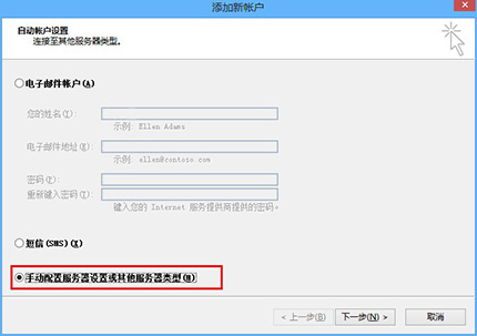 第三步,選擇【手動配置服務器設置或其他服務器類型】,點擊【下一步】;