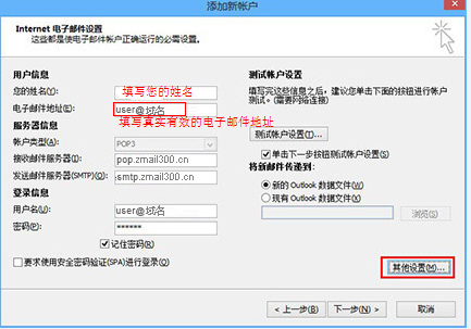 輸入發送郵件服務器(SMTP)后的輸入框中輸入:Z云郵的業務域名smtp.zmail300.cn或者輸入smtp.客戶自己公司域名