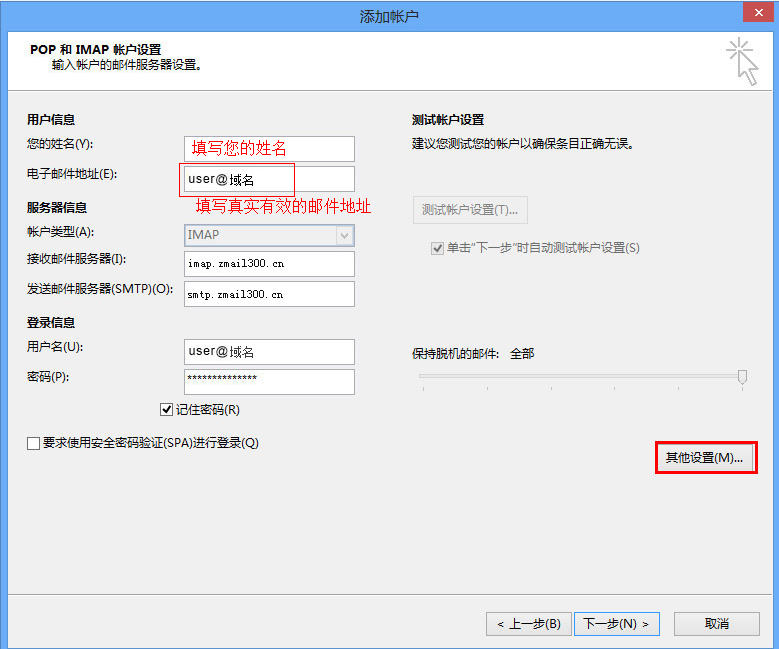 接收郵件服務器的輸入框中輸入:Z云郵的業務域名imap.zmail300.cn或者輸入imap.客戶自己公司域名