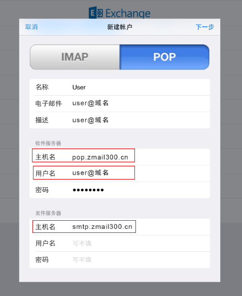 2)收件服務器中:a)主機名稱輸入:Z云郵的業務域名pop.zmail300.cn或者輸入 pop.客戶自己公司域名;